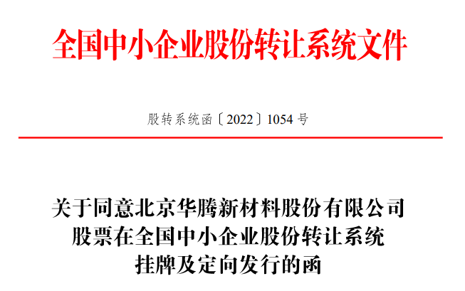 4月29日,北京華騰新材料股份有限公司(簡稱華騰新材)正式收到全國中小企業(yè)股份轉讓系統(tǒng)有限責任公司發(fā)來的 《關于同意北京華騰新材料股份有限公司股票在全國中小企業(yè)股份轉讓系統(tǒng)掛牌及定向發(fā)行的函》,這意味著華騰新材成功通過新三板創(chuàng)新層掛牌審核,為下一步在北交所上市奠定了重要基礎。