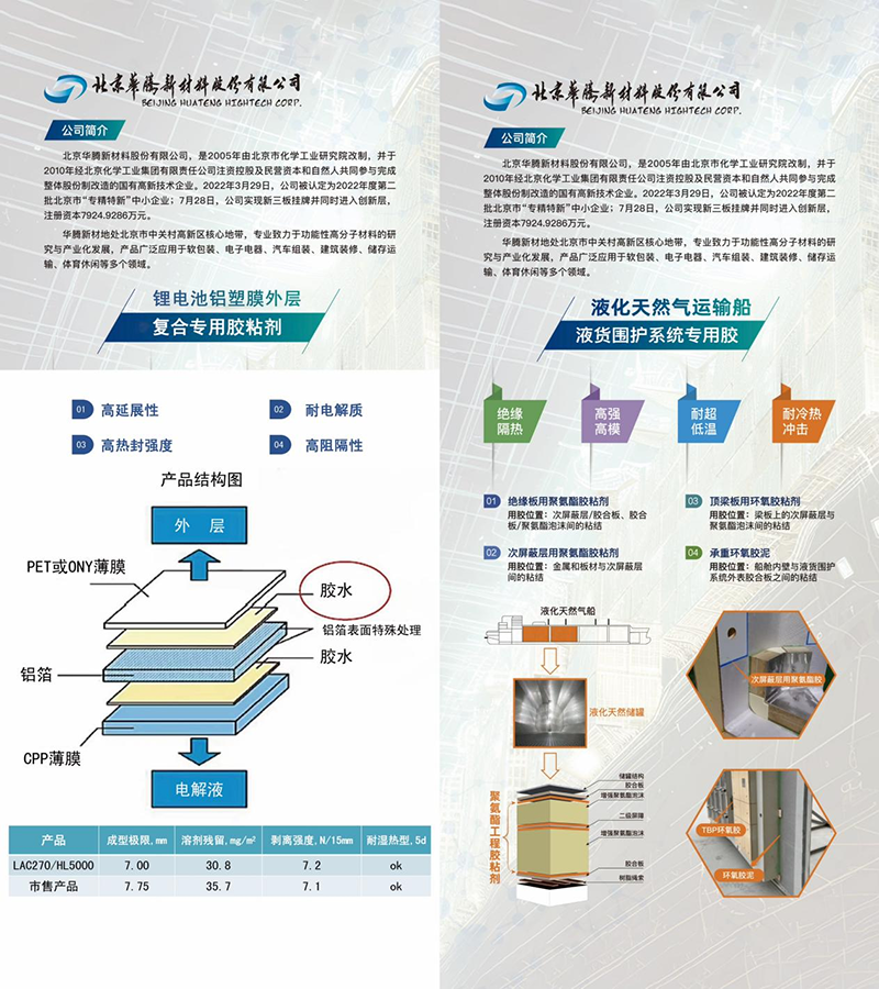 “鋰電池鋁塑膜外層復(fù)合專用膠” 用于鋰電池鋁塑外層包裝的粘接,滿足高沖深加工要求,填補(bǔ)了國(guó)內(nèi)空白。近年來,隨著鋰離子蓄電池技術(shù)的發(fā)展,采用鋁塑軟包裝材料做電池外殼成為鋰電池重要的發(fā)展方向,但特殊的使用條件,對(duì)鋰電池復(fù)合包裝用膠粘劑的開發(fā)提出新的挑戰(zhàn)。華騰新材攻克關(guān)鍵核心技術(shù),成功研制出產(chǎn)品,目前已在上海、河南等地先后投入中試應(yīng)用。